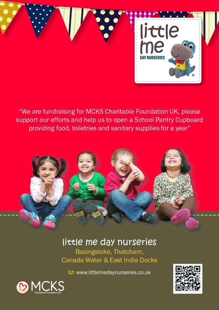 Little Me Day Nurseries is proud to be supporting MCKS Charitable Foundation UK. We are fundraising with a target of £5,200 to support a school pantry cupboard for a year. The charity supplies schools across the country with food, toiletries and sanitary supplies. Please donate generously, to find out more visit www.mckscharity.co.uk
